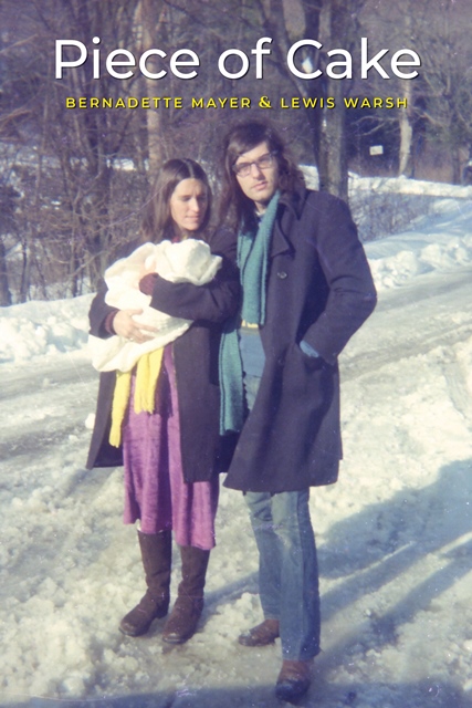 From Station Hill Press: “Bernadette Mayer and Lewis Warsh wrote PIECE OF CAKE as a work of collaborative prose poetry, based on a process of each writing on alternate days in the course of August of 1976. It recounts the quotidian nuances of young, married-with-child life, the artistic path and citizenship in the town of Lenox, Massachusetts. It has the ‘I did this, I did that; of a New York School poetry text, as characterized by the poetry of Frank O’Hara, and is somewhat reminiscent of Mayer’s work STUDYING HUNGER JOURNALS, written not long before taking up PIECE OF CAKE. As Mayer writes on August 24th, ‘I will go just one step further and take the liberty of saying that writing this book is different, for me, so completely different from any other experience I have ever had with writing. Now, when I sit down to write I tremble with fear before the page, and from the reactions of my body I can tell that the possibility of finally telling everything, and telling it as if it were all a series of plain household events, is at last coming closer.’ This work is also distinguished as arguably the first significant male-female collaboration in 20th-century American poetry. Regarding the possible derivation of the work’s title, and also exemplary of the work’s tenor, is the start of Warsh’s entry of August 29: ‘I also recall getting up and eating a piece of left-over cake (a very sweet store-bought cake with green or possibly pinkish icing) and drinking a glass of milk at the kitchen window. Empty streets, no moon. Michael and Twinkie asleep on the floor of Bernadette’s room, Guy and Karen in mine, Bill on the couch in the living room. Marie in her crib. Everyone “dead to the world,” a phrase I dislike, what a full house.’ This book also includes a section of photographs taken within the family from the period of PIECE OF CAKE’s composition.”