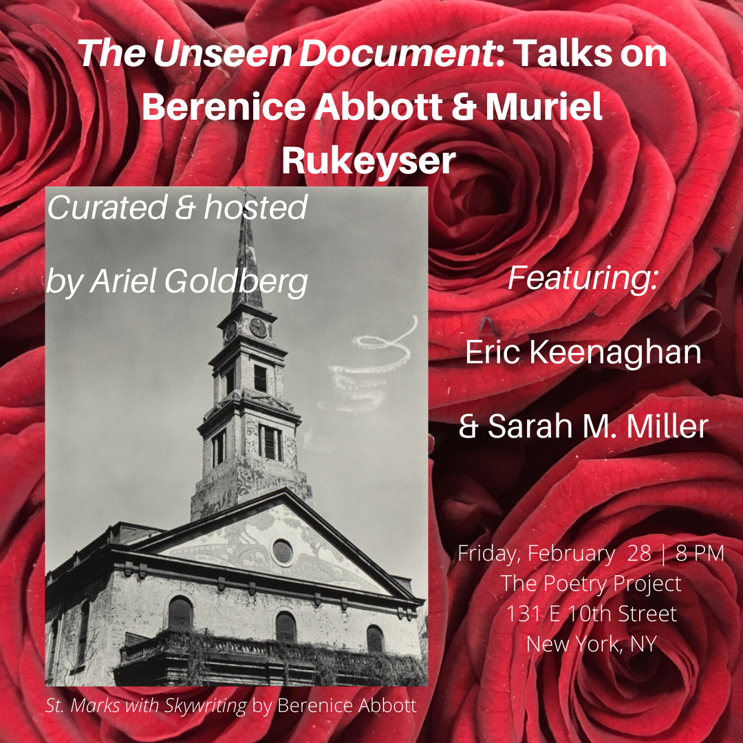 How did two of the greatest documentarians of 20th Century, photographer Berenice Abbott (1898-1991) and poet Muriel Rukeyser (1913-1980) both embed and evade their political views and personal lives in the making of their work? Join us for talks by Sarah M. Miller and Eric Keenaghan, leading scholars on Abbott and Rukeyser respectively, to think about their legacies in the context of their shared aesthetics, romance and collaboration in an era of Cold War state-surveillance. A conversation moderated by Ariel Goldberg who guest curated this event, will follow.