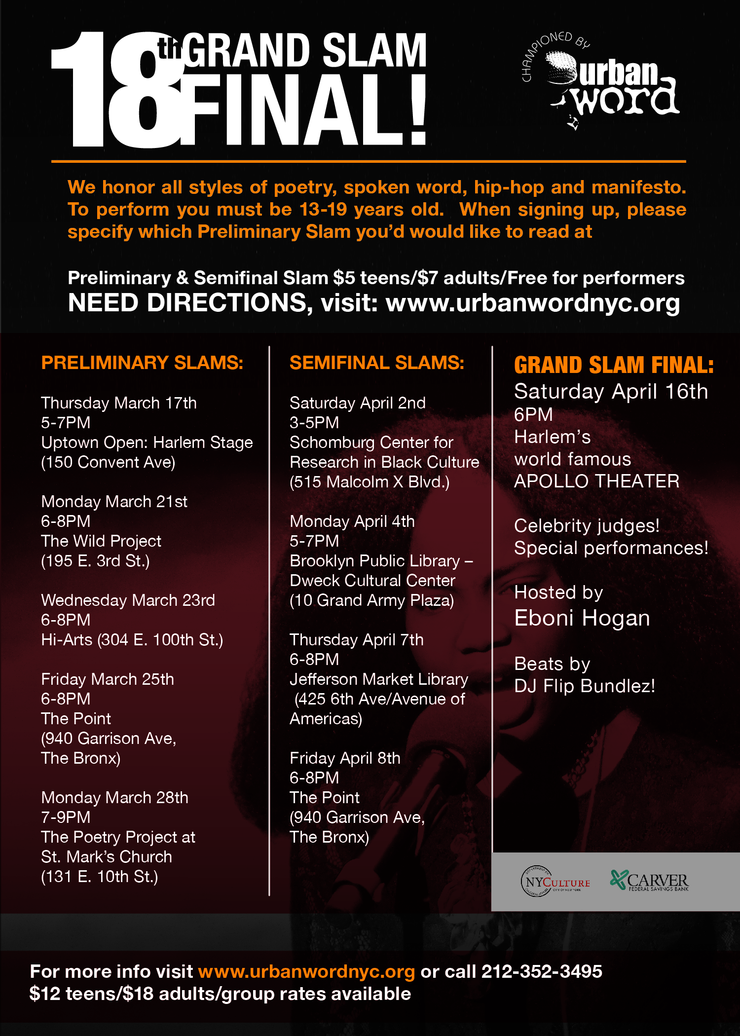 NYC’s hottest teen poets compete for a chance to represent their city at the Brave New Voices National Teen Poetry Slam in Washington DC. Come support the voices of the next generation, as they take the stage and speak their mind. To enter, poets must be 13-19 years old, and signup at www.urbanwordnyc.org – or show up. First come first serve. Audience members are encouraged to come early, as seating is limited.